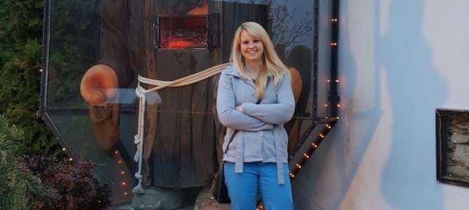 Při odchodu z areálu nám venkovní golem poděkoval za návštěvu a popřál šťastnou cestu domů. Opravdu originální!