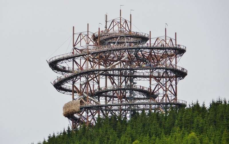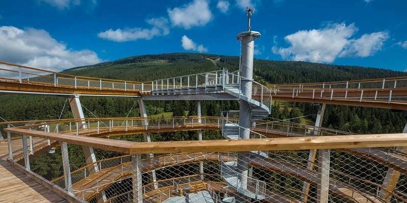Pokud vás neláká tradiční rozhledna ve věži, ideální volbou je právě Stezka v oblacích na Dolní Moravě. Jedná se o unikátní 55 metrů vysokou stavbu v korunách stromů s jedinečným výhledem na horské masivy. Pro milovníky dobrodružství je v objektu připraveno hned několik atrakcí, jako je odpočinková síť, rukáv, hnízda nebo tunel na lávce, a největší odvážlivci mohou k cestě dolů použít nerezový tobogán s okýnky.