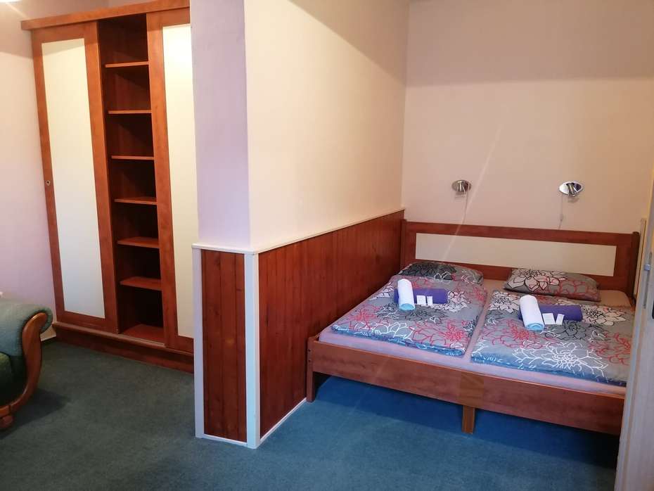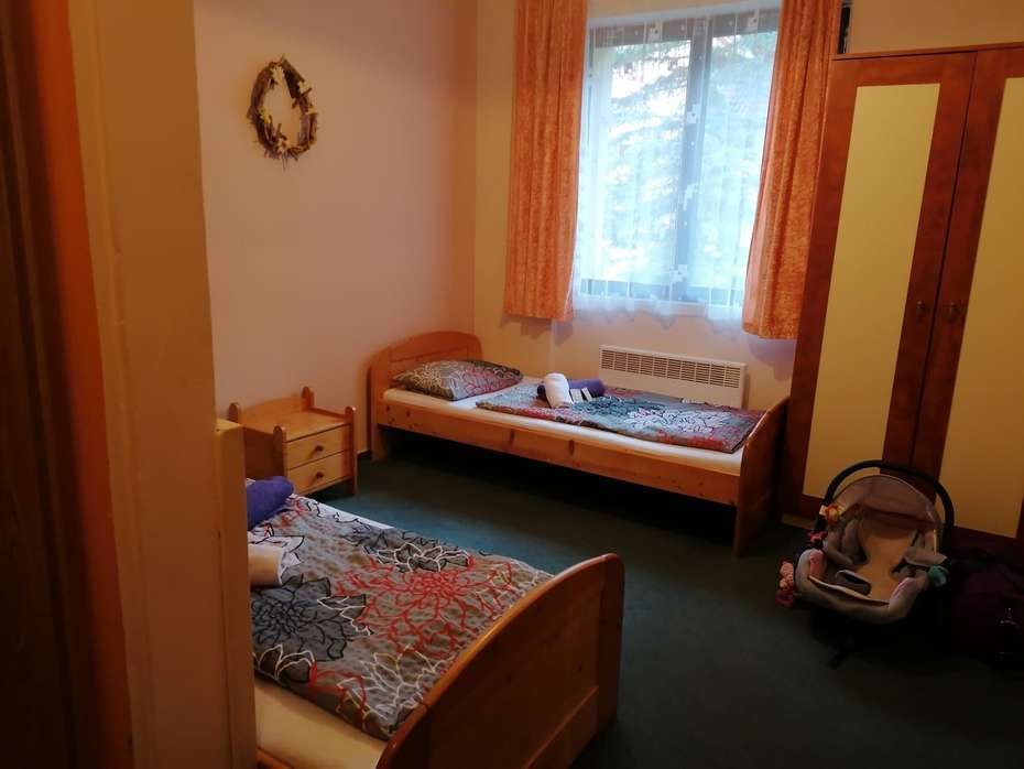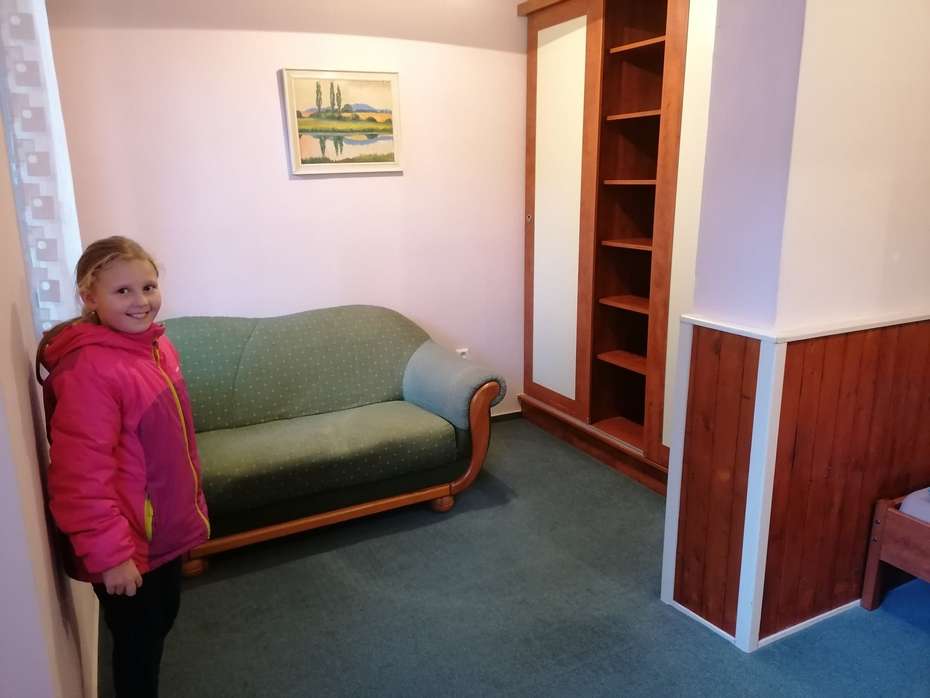 Pokoj měl chodbičku, toaletu se sprchovým koutem a dvě místnosti s rozdělenými spacími částmi, což bylo opravdu prima. Na pokoji nechyběla televize, vestavěná skříň i pohodlný gauč.