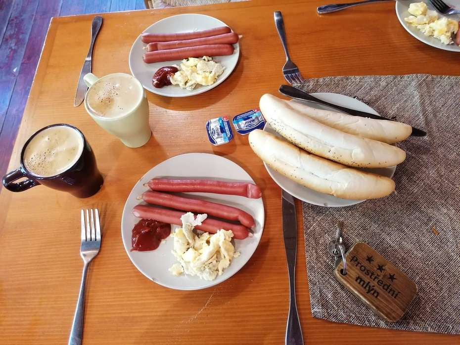 Snídaně jsou podávány formou bufetu. Najdete tu klasiku jako například vajíčka, párky, šunku, sýr, műsli, džem a navíc fantasticky čerstvé rohlíky a chléb. Nechyběla ani káva, čaj a pomerančový nebo jablečný džus.