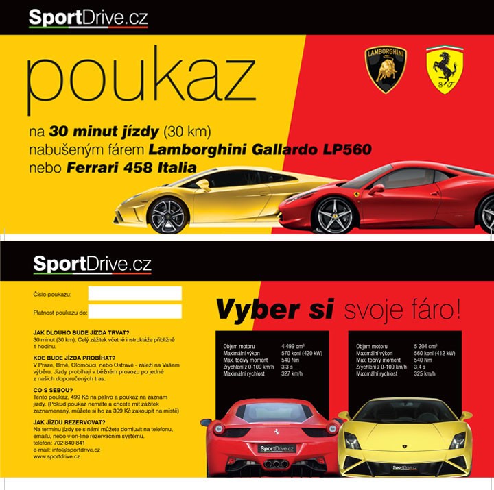 Společnost Sportdrive.cz vám umožní svést se v jednom z nejrychlejších vozů světa. Splňte si svůj klukovský sen a projeďte se v italském supersportu za 6 milionů korun. Kde jinde si zařídíte auto, které pod kapotou skrývá 570 koňských sil? Nebo si vyberete Lamborghini Gallardo? Ryzí supersport poháněný pětilitrovým deseti válcem vám rozbuší srdce a rozproudí adrenalin! Tyto sporťáky otestovali i zaměstnanci SlevaDne.cz a byli nadmíru spokojeni.