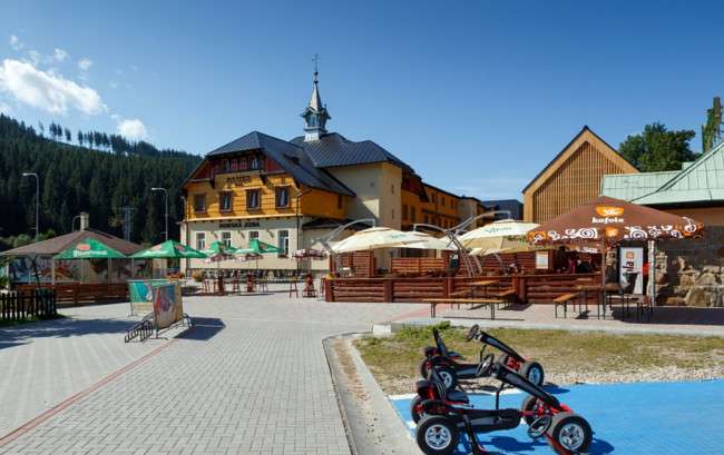 Přímo naproti hotelu je nástupní stanice Zbojnické lanovky, která vás vyveze i s koloběžkami na startovní dráhu hned dvou koloběžkových tras a to 1. Zbojnická - koloběžková trasa (4,5 km) a za 2. K osadě Kavalčanky (10 km). Na obou trasách si vyzkoušíte hned tři druhy povrchů, a to lesní cestu, částečně zpevněný povrch a asfalt.