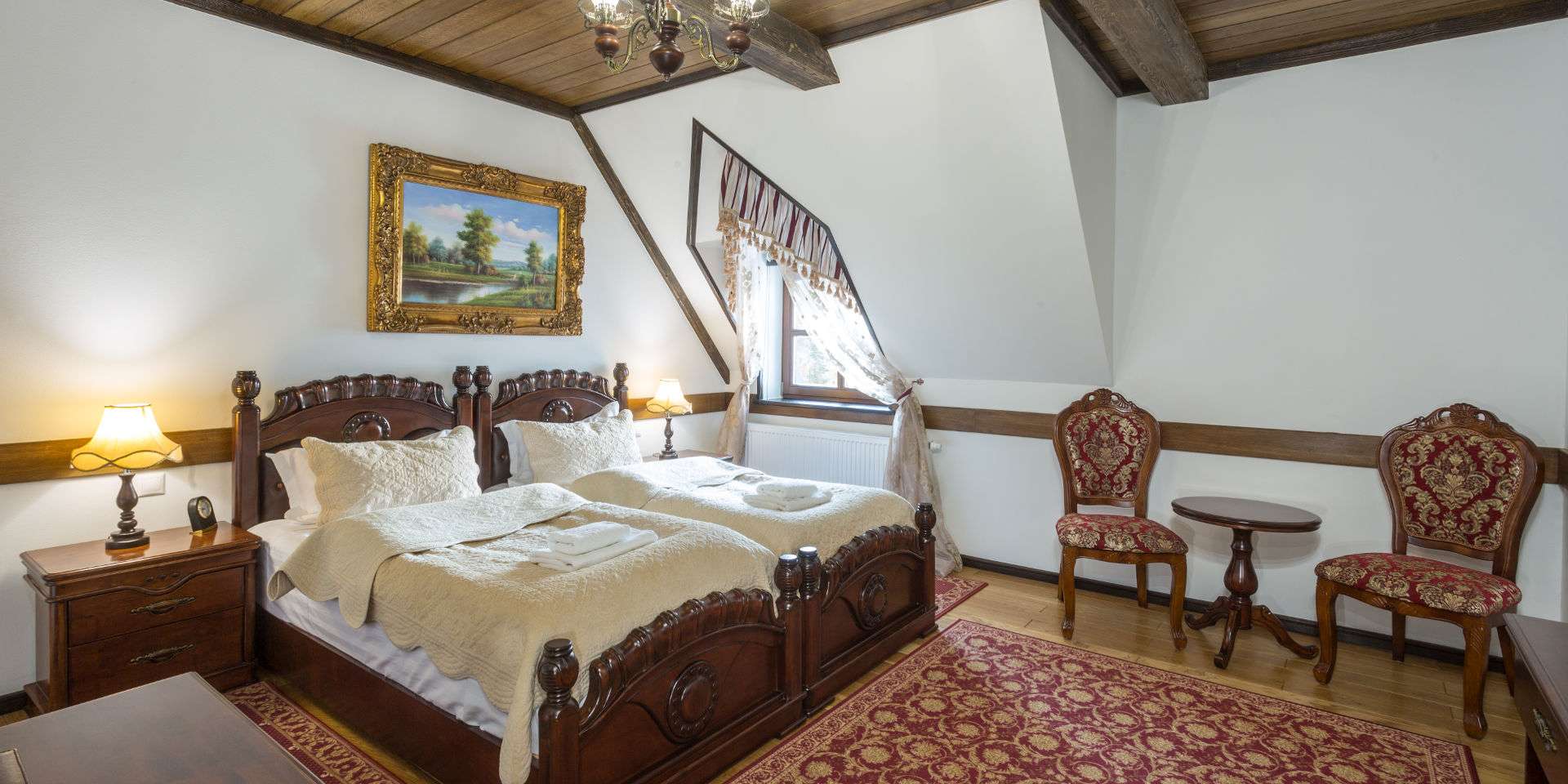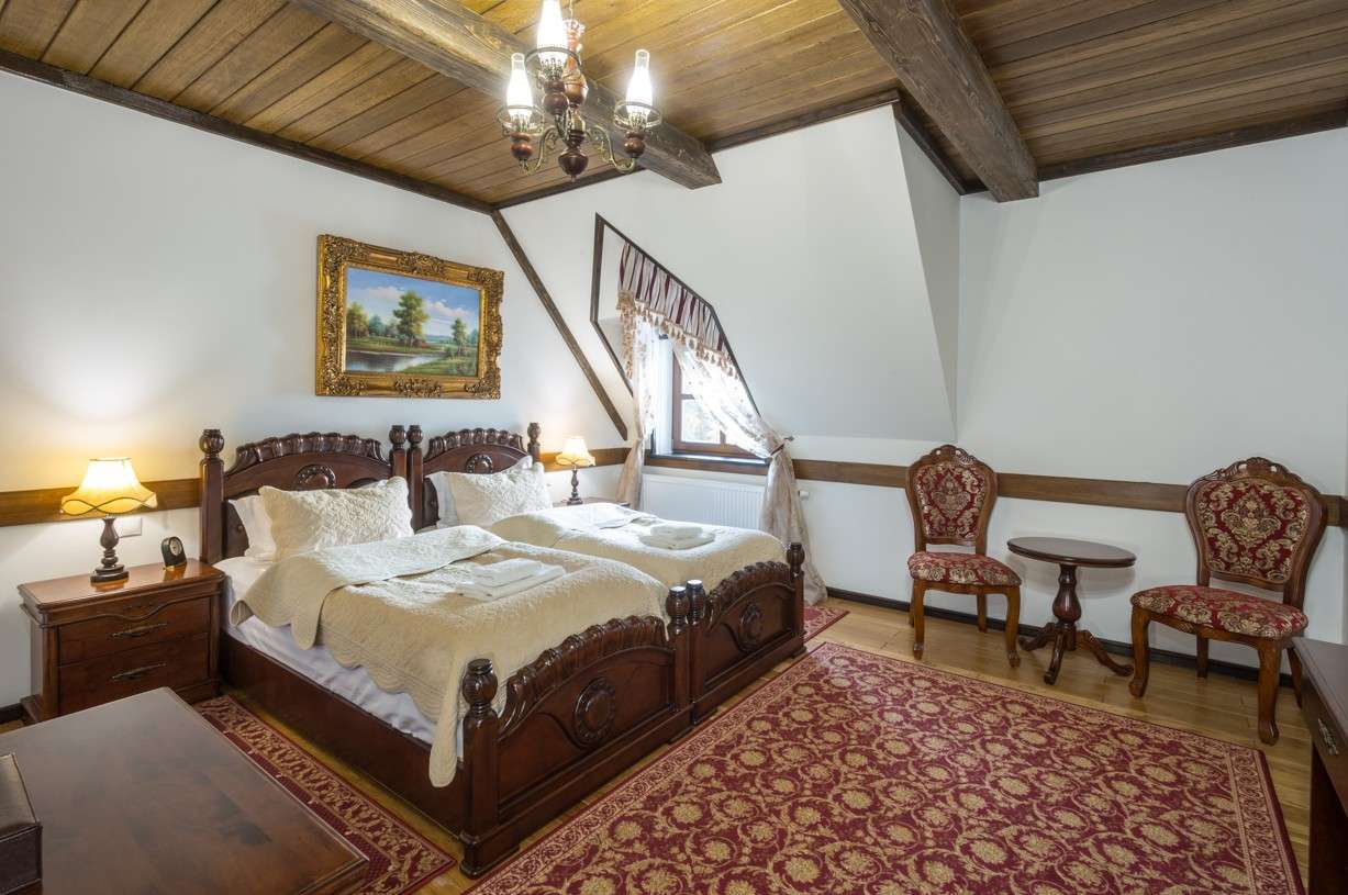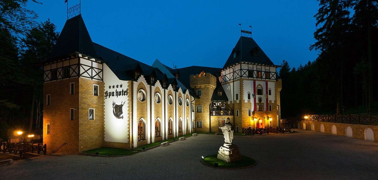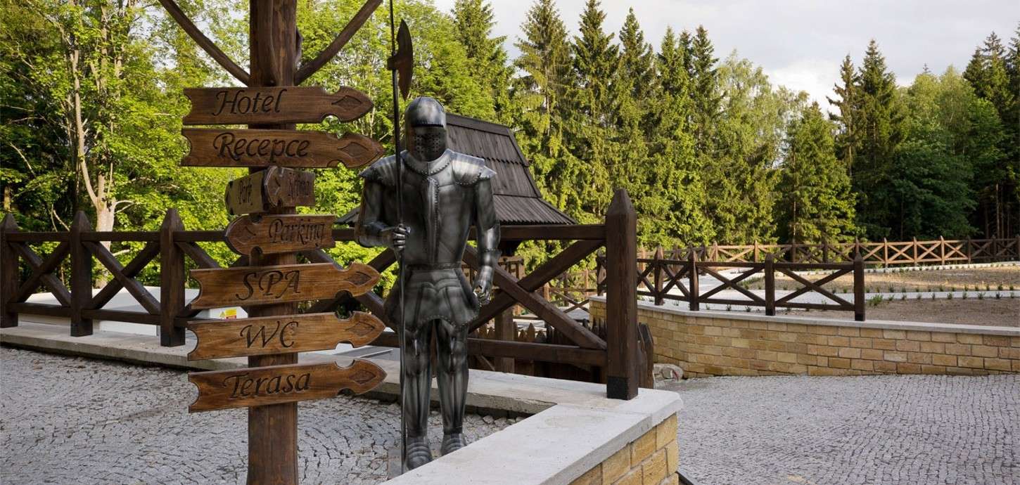 Hotel je stylizovaný do podoby loveckého zámečku tak, aby připomínal lovecká sídla šlechticů. Masivní dveře se starým kováním, starožitné lampy, rytířská brnění, erby královských rodů a lovecké trofeje – každý detail interiéru je promyšlený tak, aby hosté byli obklopeni epochou rytířů a králů. Idyla malebné přírody a mystické ticho je rušeno pouze zpěvem ptáků.