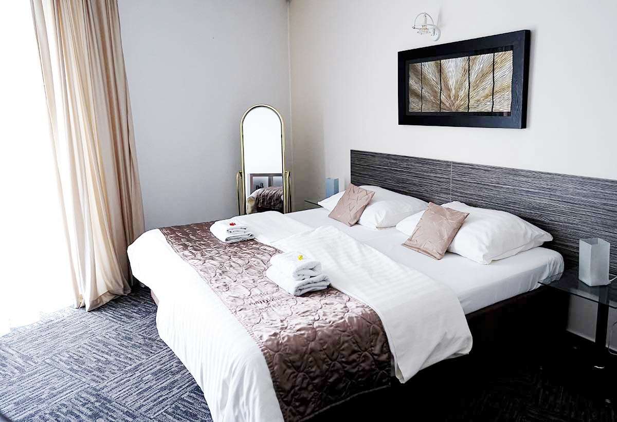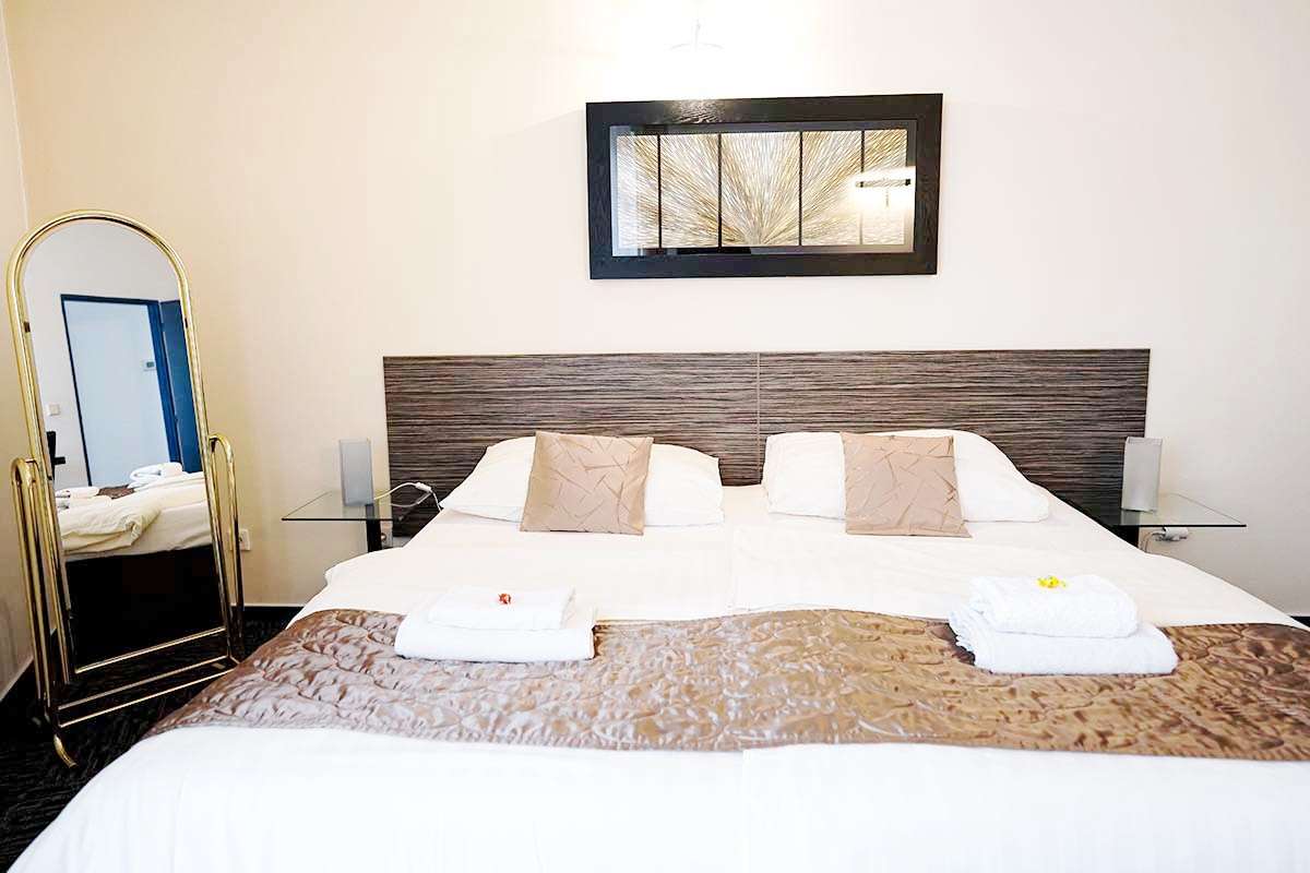 Všechny pokoje jsou standardně vybavené king-size postelemi 200x200 cm, vlastní koupelnou se sprchovým koutem či vanou, toaletou, minibarem, fénem, telefonem a zdarma připojením na internet přes wi-fi.