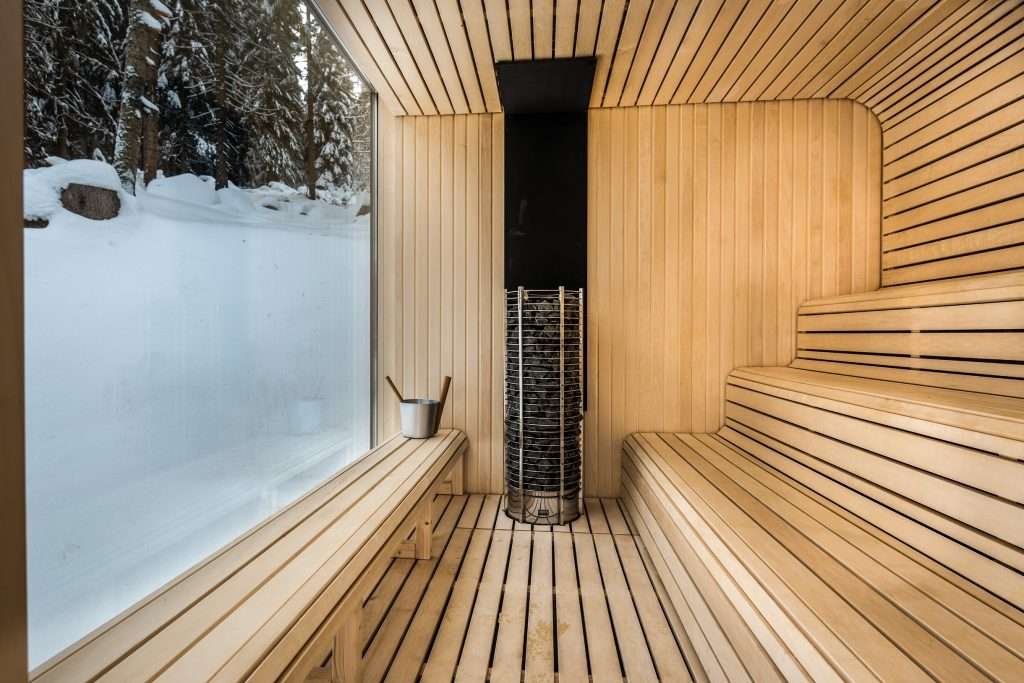 Minimalistický dizajn, všadeprítomné drevo a prírodné materiály. Drevo zvnútra svetlé, bielené pre pocit priestranného interiéru. Zvonka tmavé pre maximálnu nerušivosť a splynutie s lesom.