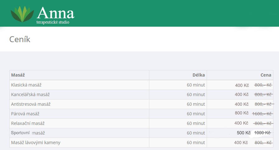 Ulevte svému tělu od napětí, bolestí a stresu u některé z masáží dle vlastního výběru. Studio Anna je velice příjemné, útulné s uklidňující atmosférou, čistými ručníky, pozitivní náladou a hlavně milými a zkušenými terapeutkami.